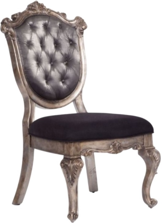 This Chantelle dining side chair blends antique elegance with modern comfort. Featuring a padded seat, ornate scrolled top trim, and a regal crown design, the chair rests on graceful Queen Anne–style legs. Its wooden frame in antique platinum and silver gray brings timeless charm to any dining space.Read More