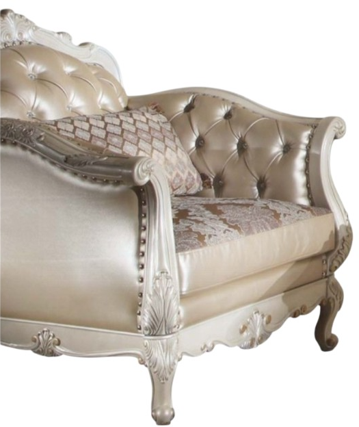 The Chantelle chair is filled with romantic wonder. This chair features a rose gold PU seat back, floral pattern and PU seat cushions, with pearl white wood finish, crystal like button tufted back, arms, and back, and tight back with loose seat cushions.Read More
