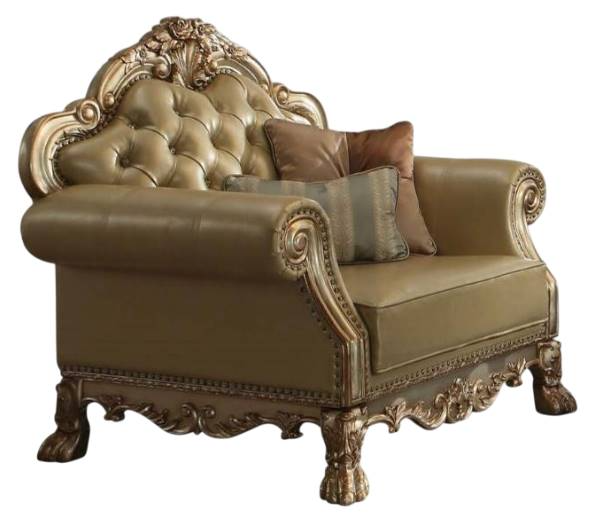 The Dresden gold patina and bone faux leather chair has a traditional feel, featuring decorative carvings, inlay veneer ball and claw feet and hand brushed gold accents. The seat and back have a faux leather button tufted cushion with Nailhead trim. Comes with 2 pillows to add comfort with sophistication.Read More