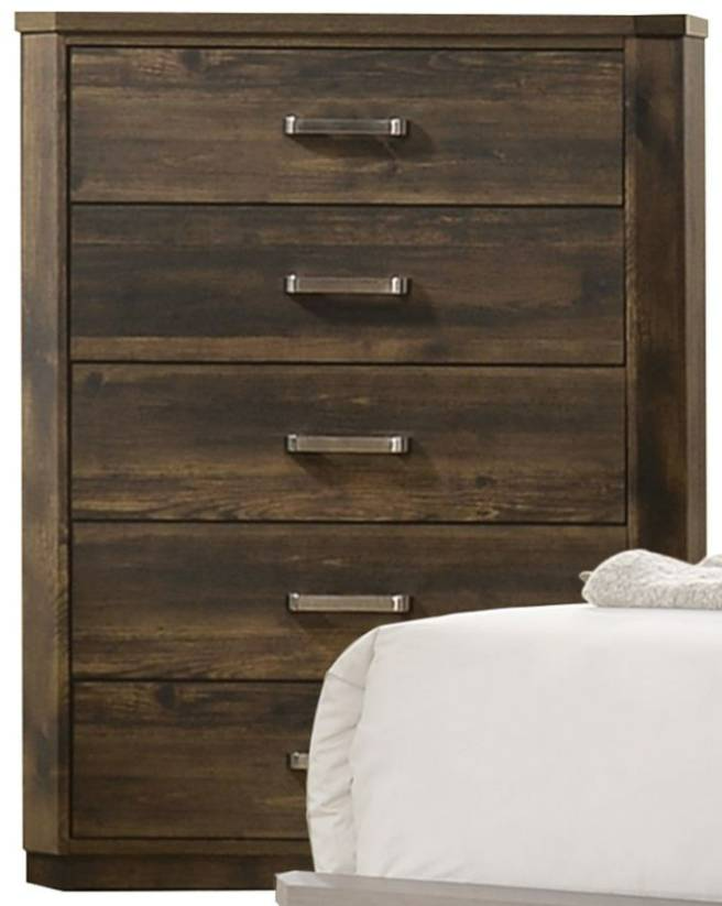 The simple lines and walnut wood tones create a sooth-full aesthetic with this plank influenced bedroom set. Practical design features include easy-grasp pulls that accentuate the collection with a polished finish. Dresser and chest offer room to store essentials and, the rectangular mirror rounds out this set for a remarkable rustic style.Read More