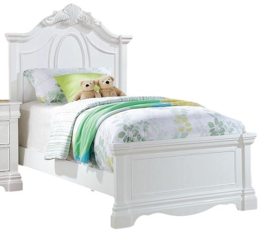 The Estrella girl's bedroom collection features decorative crown carving on headboard and mirror. Its matching case goods decorated with white finish hardware, which is simple but elegant. This gorgeous collection will be perfect for your princess.Read More