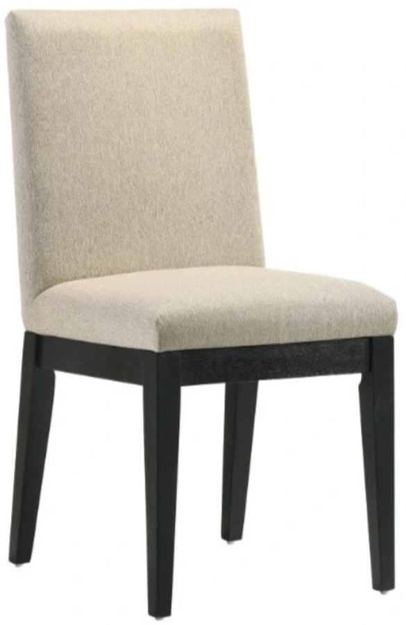 The fully padded backrest and seat provide exceptional comfort, allowing you and your guests to enjoy extended periods of sitting without discomfort. The generous padding offers a plush and supportive seating experience, ensuring a cozy and enjoyable dining atmosphere. Upholstered in a chic beige fabric, these chairs exude sophistication and versatility. The black wooden legs of the chairs add a modern and sleek touch to their design.