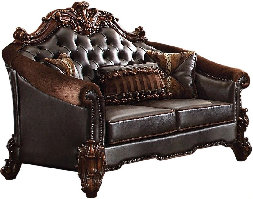 The Vendome II loveseat's two-toned brown faux leather and cherry upholstery is grand and classy with crystal like button tufting on the back in a crackled gold patina finish richly accented with gold leaf brushed onto each piece by hand.Read More