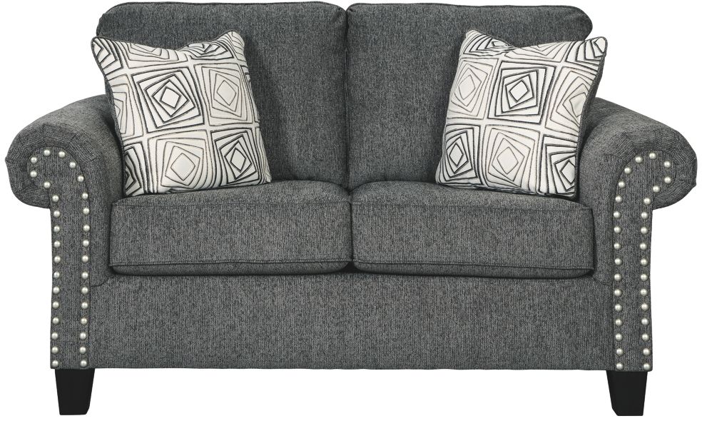 A contemporary dream. This loveseat checks off everything on your list. Its designer profile is accentuated with roll arms and pewter-tone nailhead trim. Upholstered in a textured chenille, the feel is up to par with the look. Geometric throw pillows and tapered accent legs finish off the loveseat's top-to-bottom style.Read More