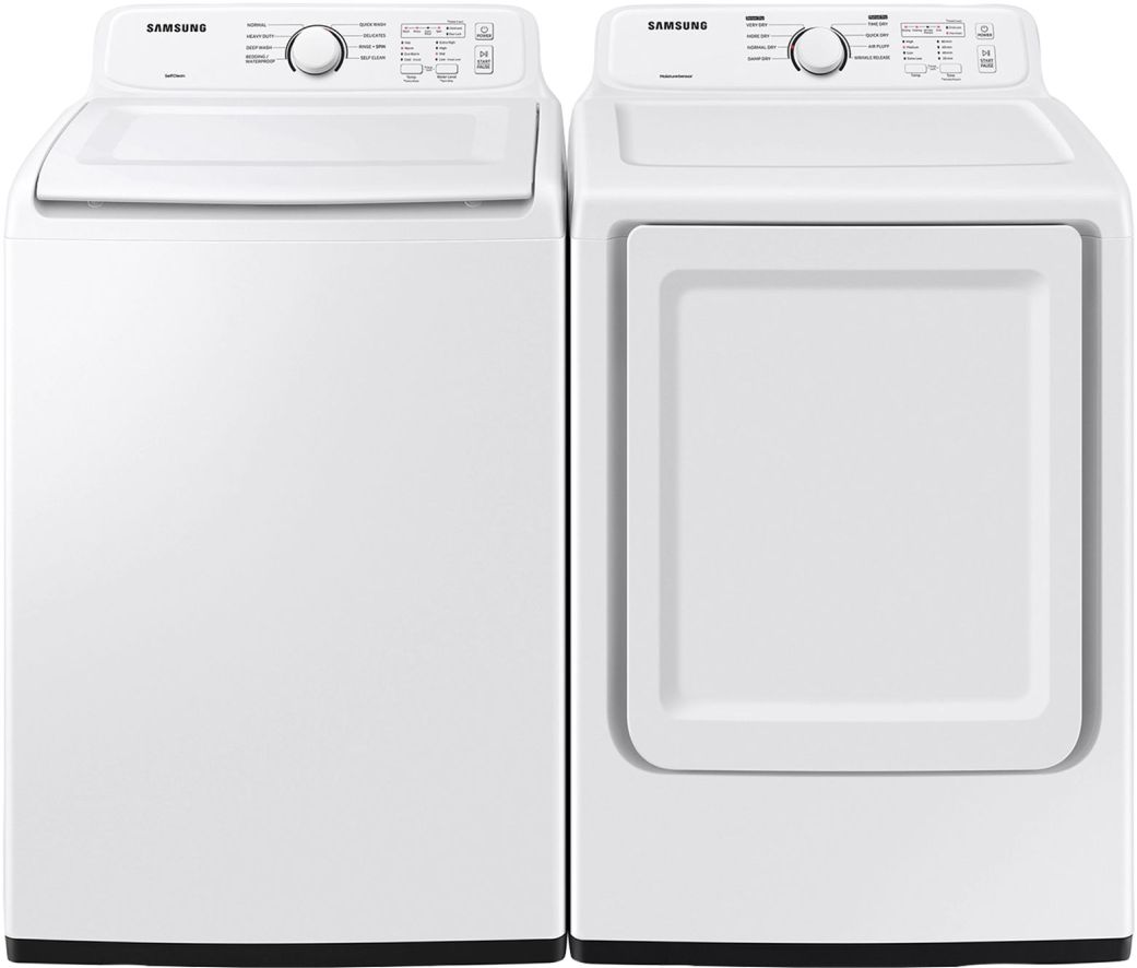 Samsung White Laundry Pair with a 4.0 cu. ft. capacity top load washer and a 7.2 cu. ft. capacity front load electric dryer.Read More