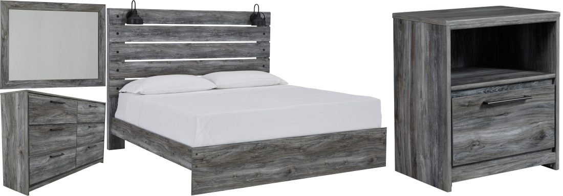 Smoky gray finish over replicated Oak grain with authentic touch. Contemporary handles in an antiqued gunmetal finish. Side roller glides for smooth operating drawers. Mirror has the versatility to mount on the dresser or to the wall horizontally or vertically. Panel headboard feature decorative matte black sconce lights.Read More
