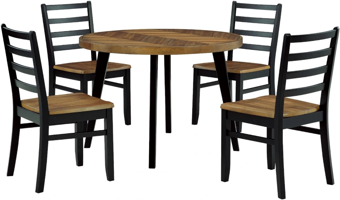Transform your dining area into a delightful rustic retreat with this five-piece table set. A two-tone finish adds a layer of charm, creating a visually appealing look that catches the eye. The tabletop's inlay chevron pattern adds a unique and stylish touch, while ladderback chairs complement the overall design.Read More