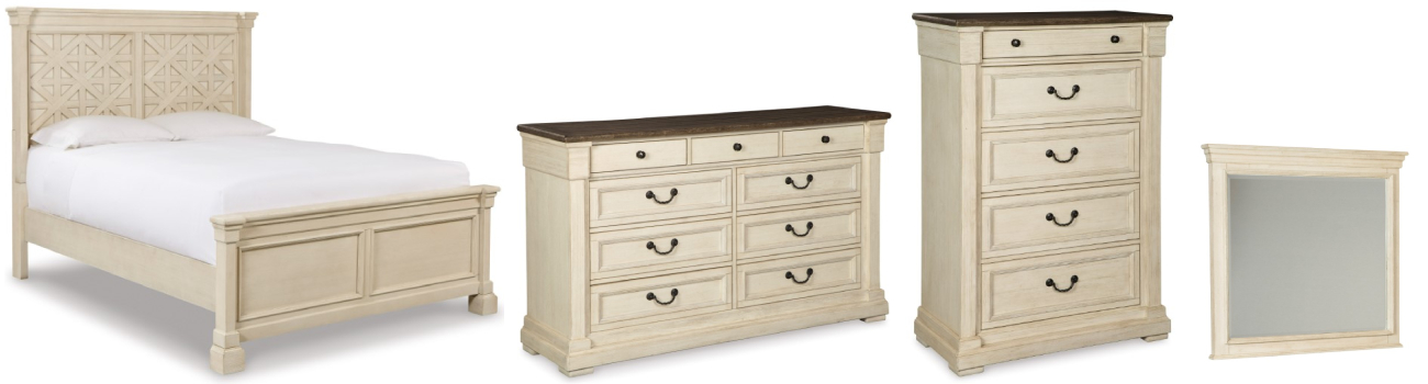 Includes queen panel bed(headboard, footboard, rails), dresser with mirror and chest of drawers