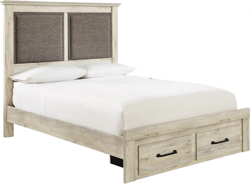 Includes queen upholstered panel headboard, storage footboard and panel rails