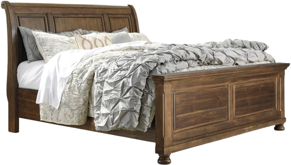 A fresh, new take on traditional style. This king sleigh bed meets today’s design tastes with beauty and grace. Tobacco brown finish allows the natural grain of the Acacia veneers to show through in an organic way. Profiled crown moulding adds depth to the headboard and footboard. This is a look you can appreciate for years to come.Read More