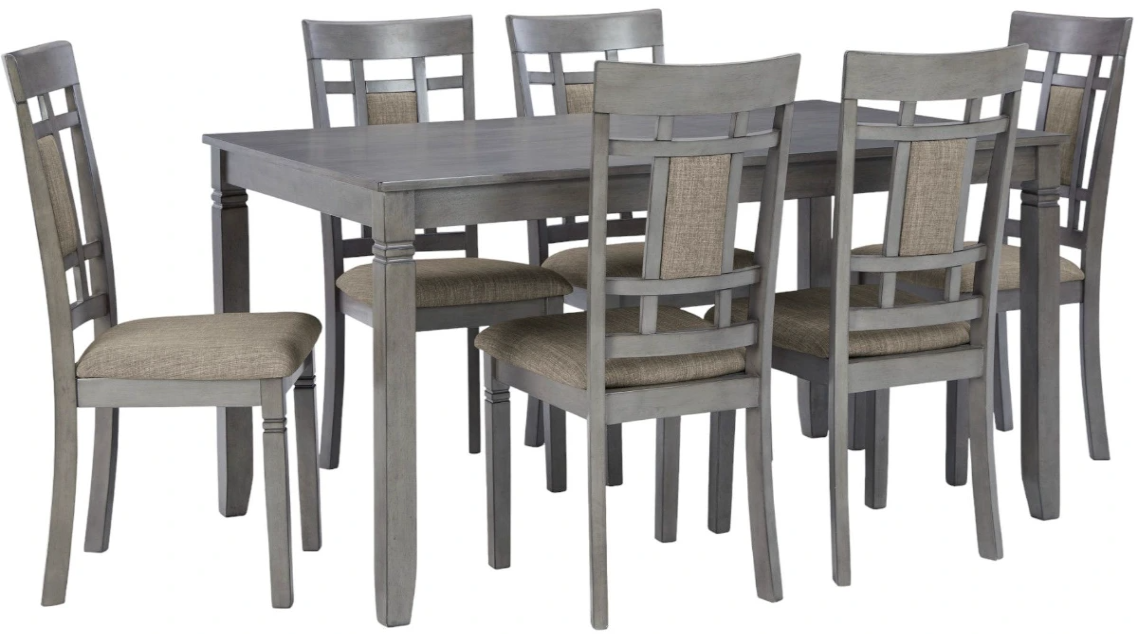 Make a dynamic statement with this dining set. Nothing says "cool" quite like its charcoal gray finish and the open lattice-back design on the six included chairs. With the sturdily made leg table and easy-to-clean polyester fabric on the chair, this set is suitably stylish and functional.Read More