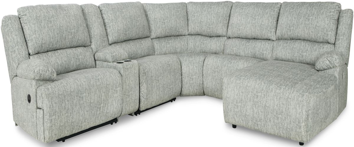 Includes 6 pieces: left-arm facing recliner, armless recliner, wedge, console with storage, armless chair and right-arm facing press back chaise