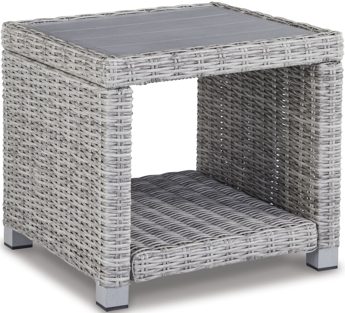 Indulge in backyard bliss. This outdoor end table has a straightforward sense of style with its light gray resin wicker. The table's rust-proof aluminum is enhanced with a wood-look finish, weathering the elements and keeping your aesthetic casually cool.Read More