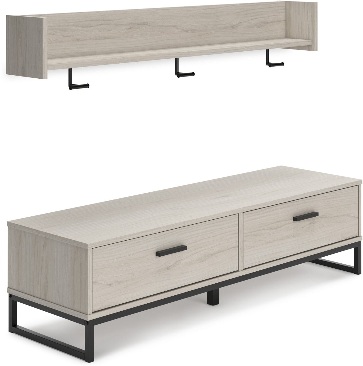 Spruce up your entryway or mudroom with this streamlined storage bench and coat rack. Two spacious drawers are your new go-to spot for hats, scarves and outdoor gear. Contemporary handles and sled-style legs with a dark pewter-tone finish emphasize the sleek, contemporary profile.Read More