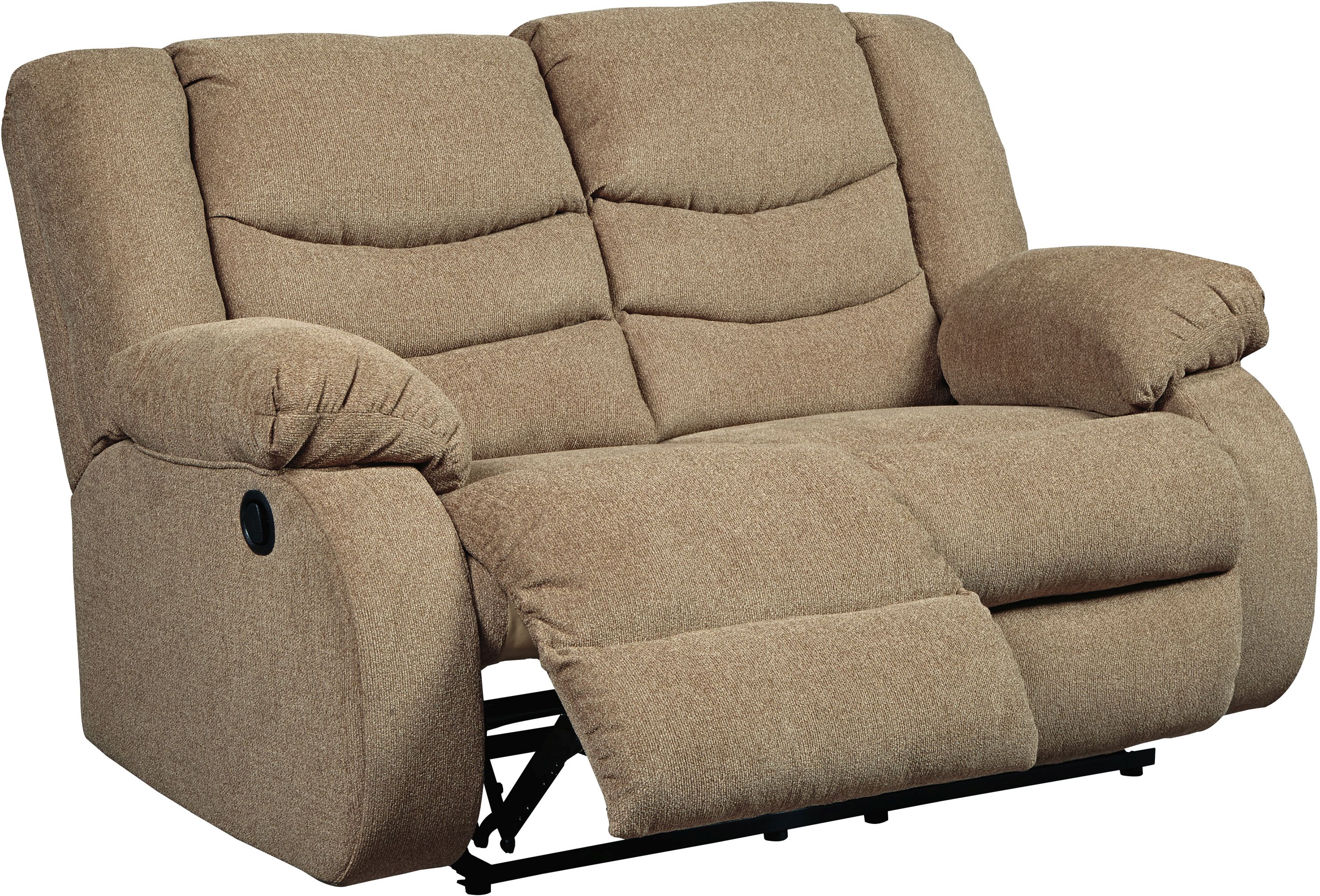 With the dual-sided reclining on the Tulen loveseat, you just need one place for laid-back relaxation. Cuddle up with someone special on the high resiliency foam cushioned support and the 2 padded footrests are feel-good from head to toe.