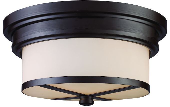 This flush has a stepped pan, decorative metalwork, and opal white glass. Shown in oiled bronze color and off-white glass shade. Add a unique and eye-catching style by incorporating this in your home.Read More